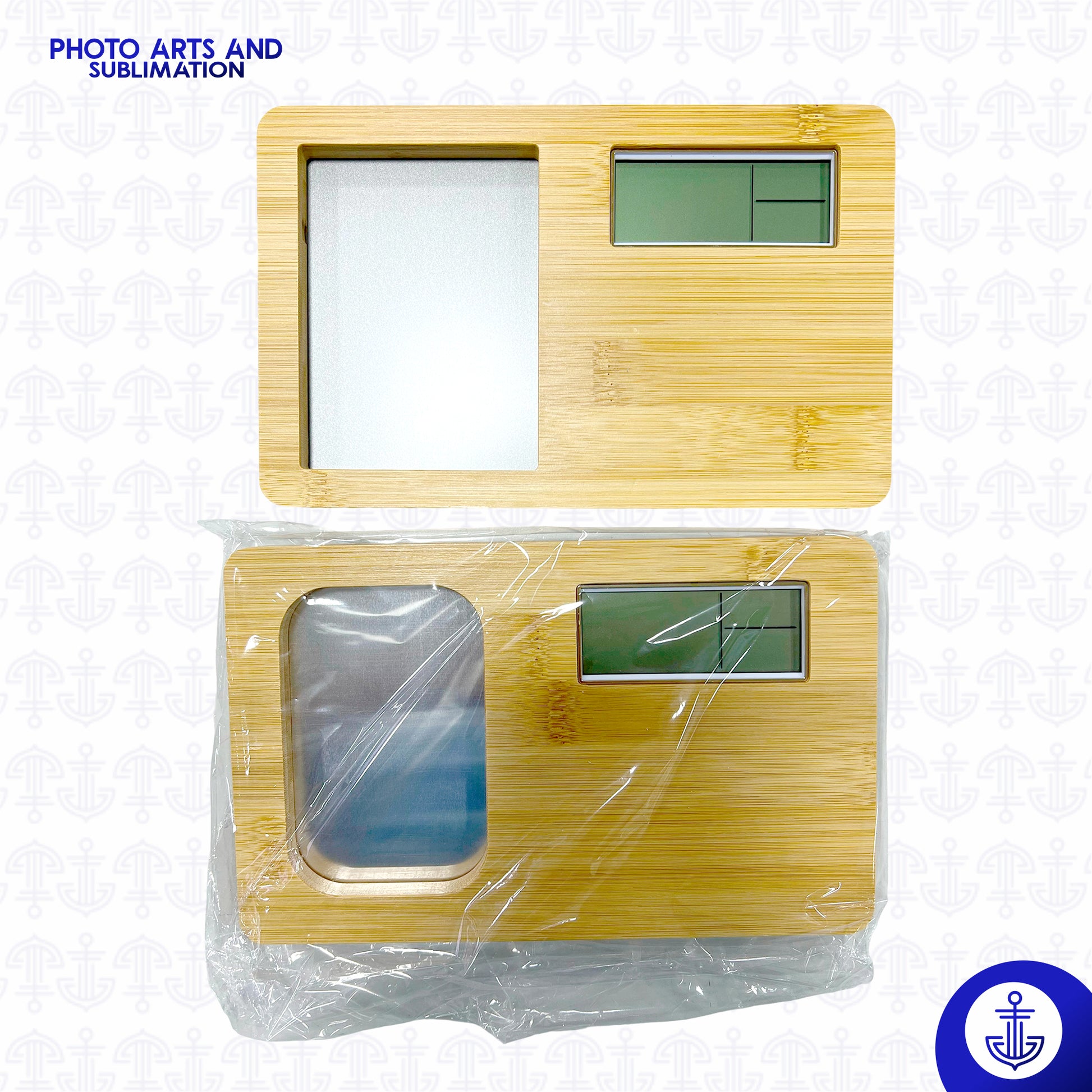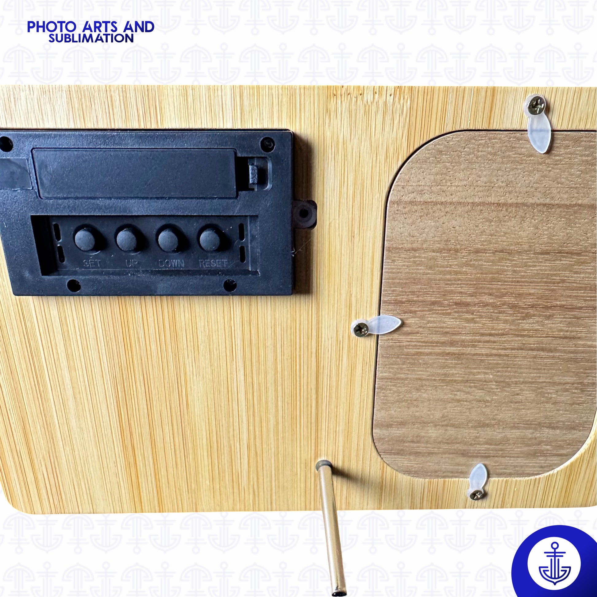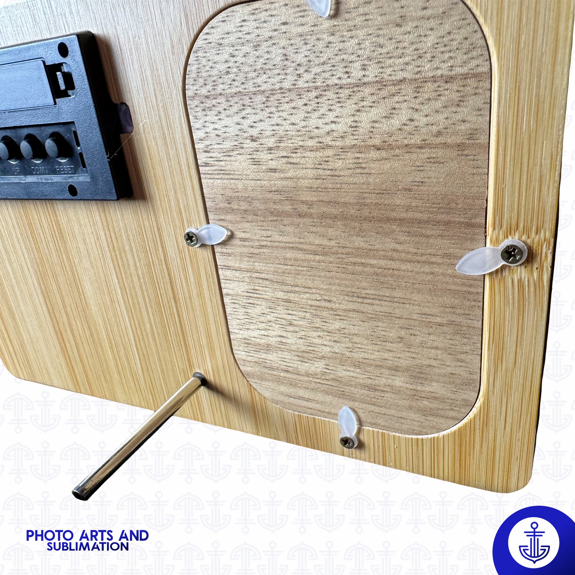– Tecnología y Personalización en un Solo Producto Reloj digital de madera con placa sublimabl incluida, apto para poner en superficies planas gracias a su soporte de metal en la parte trasera.